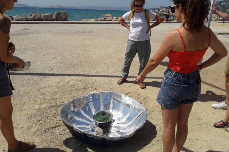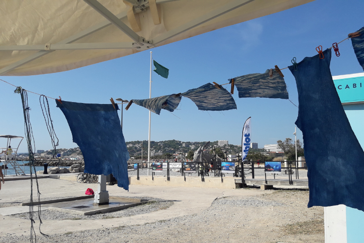 Ces récits ont été illustrés lors d’ateliers de dessin sans crayon, pour constituer un lexique collectif de formes. Ensuite, de grands ateliers de teinture végétale avec les plantes du littoral ont été organisés pour teindre les tissus et former une gamme de couleurs propre au territoire.